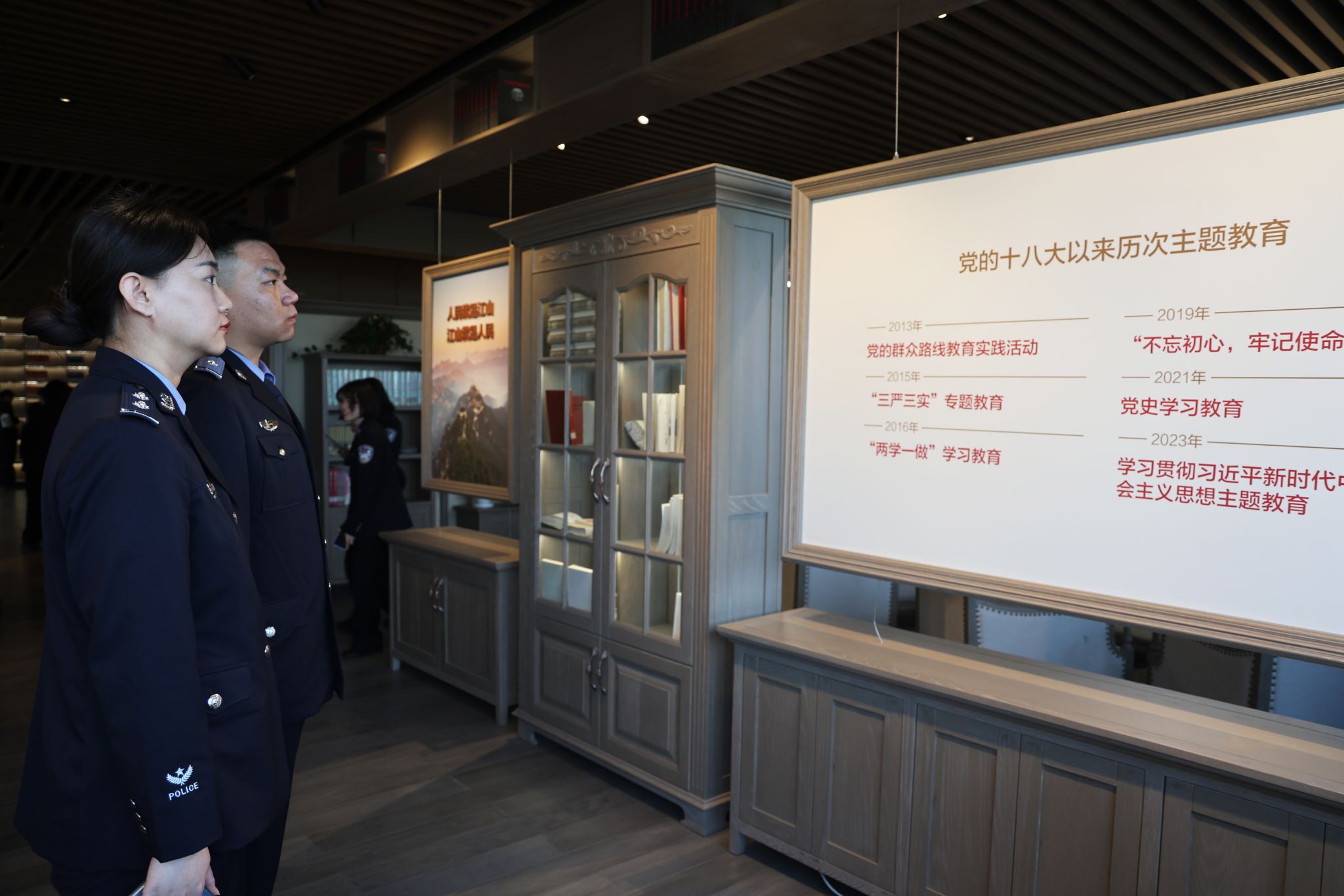 大家在展台前认真翻阅、驻足研读,深刻感受习近平新时代中国特色社会主义思想的实践脉络。