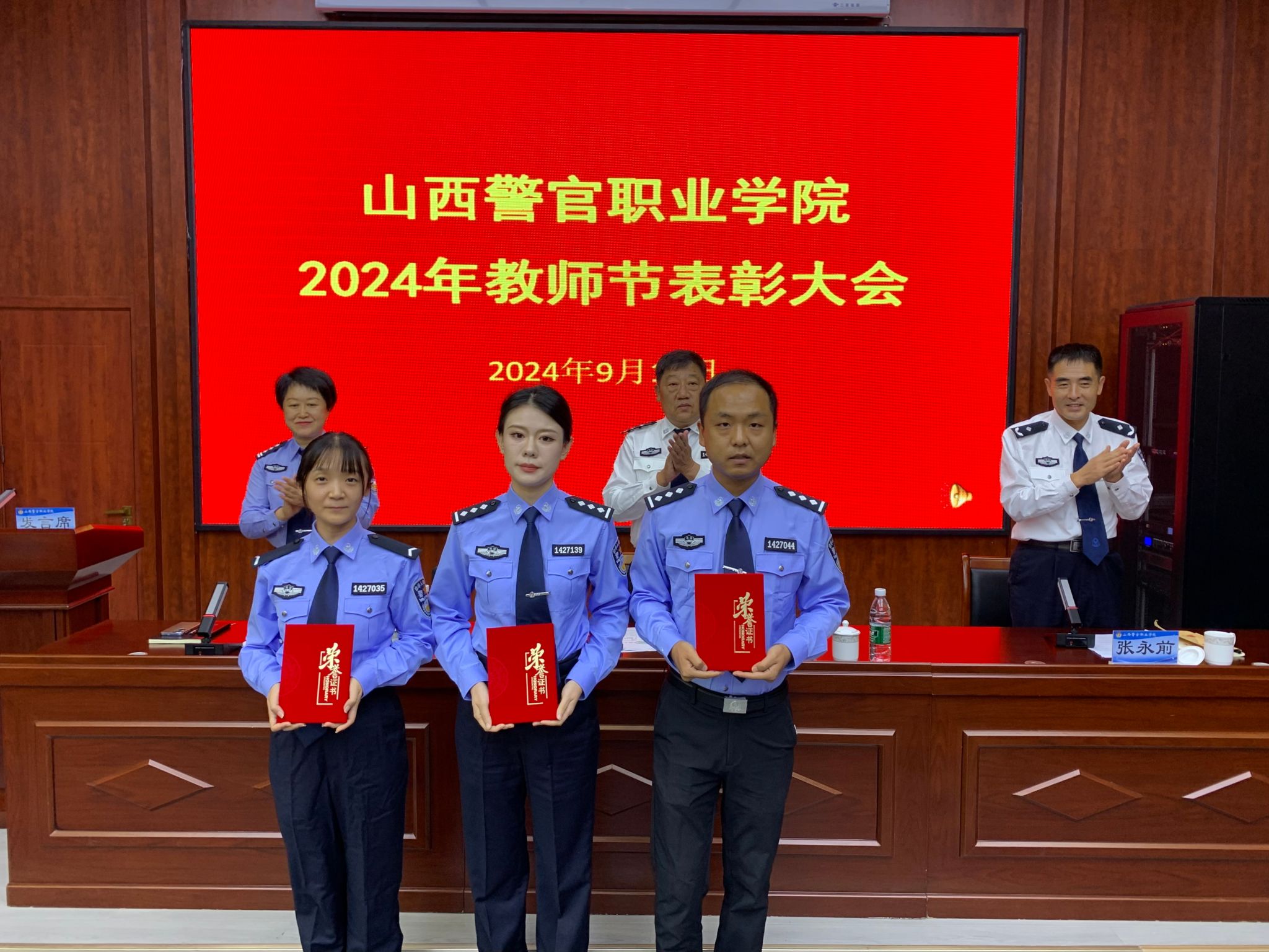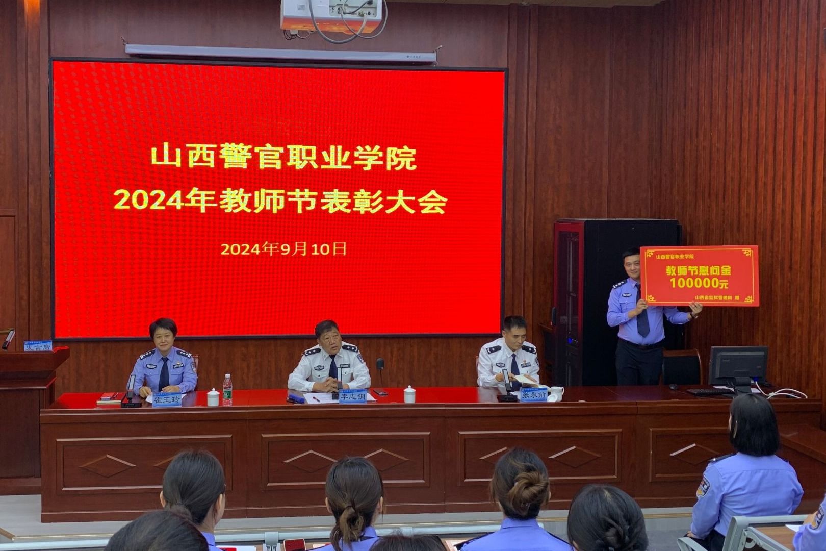 9月10日下午,beat365隆重举行庆祝第40个教师节表彰大会。省监狱管理局向beat365赠送了慰问金。院党委书记、政委李志钢出席会议并讲话,院党委委员、纪委书记霍玉玲宣读表彰决定。会议由党委副书记张永前主持。全体教职员工参加会议。