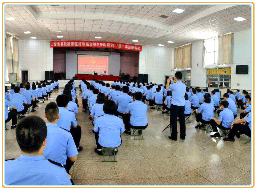 杨立明主任作了题为《抗疫不分你我他 全民协力护中华—一线抗疫经历及感触》的报告,他用朴实的语言、真挚的情感,讲述了他从临危受命、逆行出征、赴仙桃抗疫、艰苦鏖战58天的亲身经历和感人故事。作为一名共产党员,杨立明主任感触颇深:所谓英雄,就是一个个坚守岗位、爱岗敬业、不忘初心、乐于奉献、勇于担当的普通人;能够参与这场抗击疫情的严峻斗争,是使命也是荣耀,是磨炼也是守护,虽然艰辛,却感受到身为白衣战士的职责与光荣,这是一次弥足珍贵的人生经历;在援鄂过程中,无论是人员组织、物资调配还是后勤保障等各方面,都能真切感受到祖国的强大、社会主义制度的优越、全国人民的众志成城、湖北人民的真情厚意.......