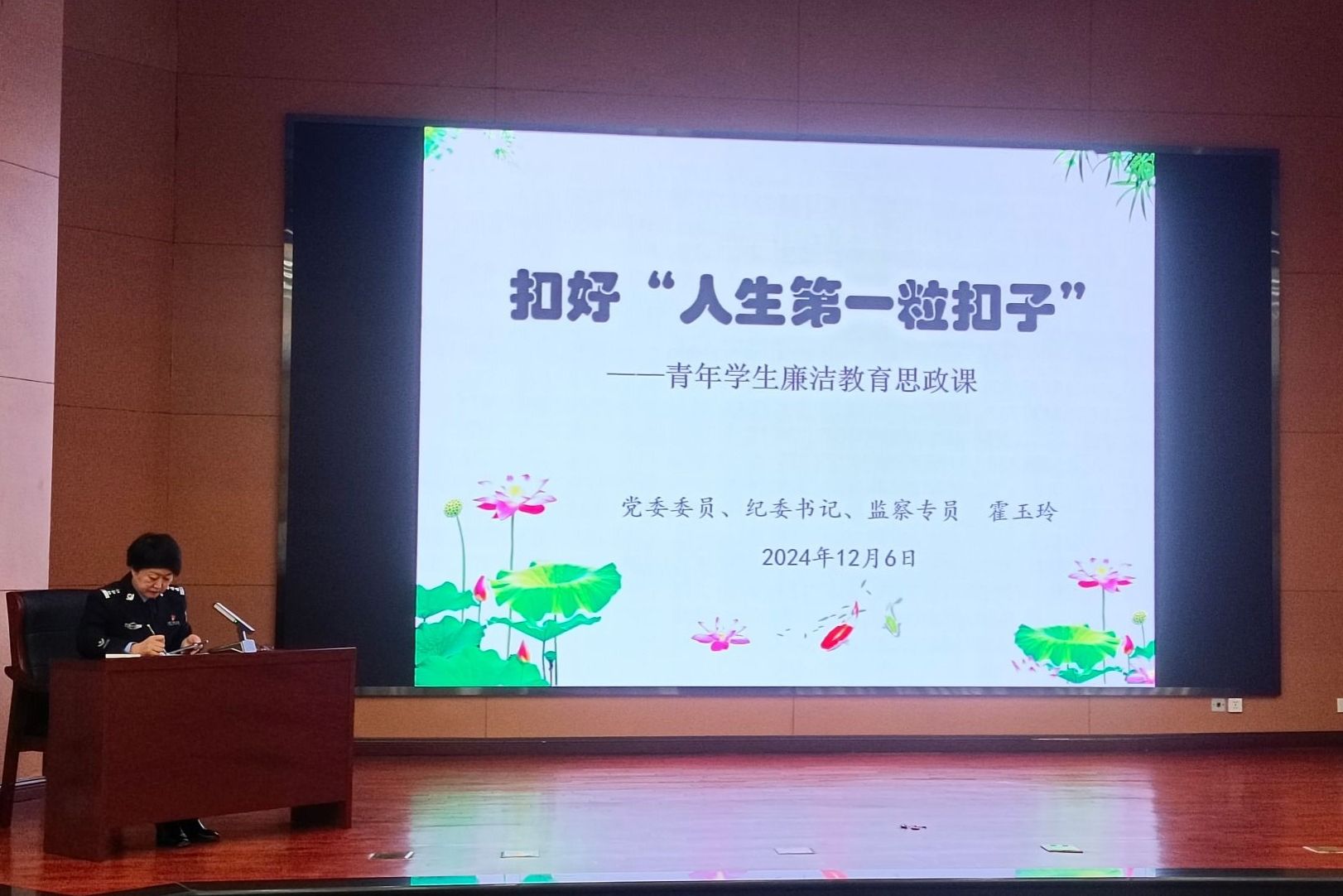 霍老师从我国反腐斗争的现状和对策、青年学生要用廉洁文化滋养身心的原因和方法等方面,引导学生们惟廉于心、倡廉于行,同时结合案例介绍腐败问题易发多发的风险点,提醒大家要“在成长拨穗期扣好廉洁自律‘第一扣’,在成长黄金期系好廉洁自律‘安全带’”,要始终坚守信念初心,努力为中华民族伟大复兴贡献自己的青春力量。