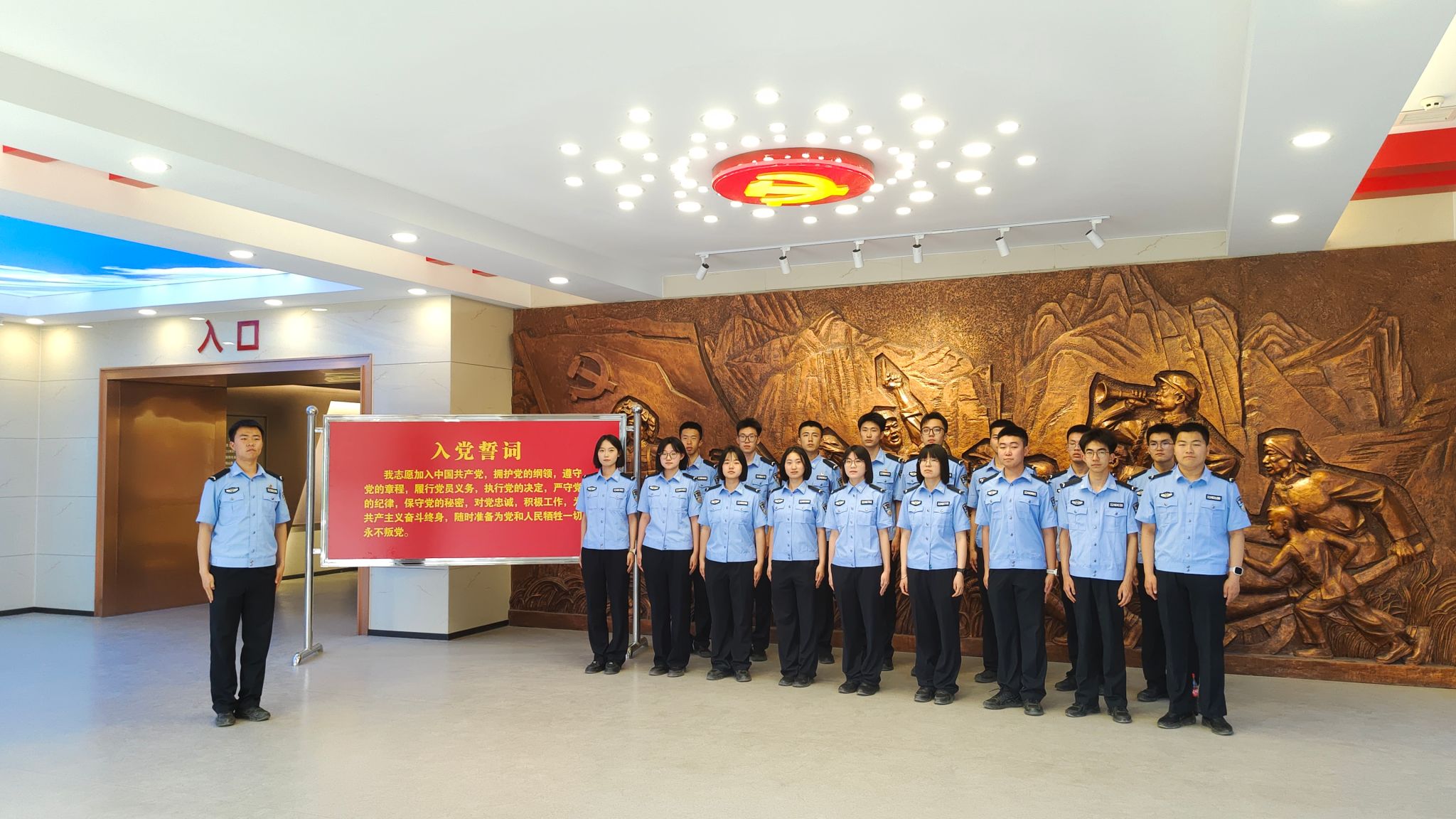 宣讲团成员整齐列队于鲜红的入党誓词展板前,齐声庄严宣誓:“请党放心,强国有我!”宣誓毕,成员们依次上前,怀着滚烫的信仰与深沉的敬意,将心底对党的忠诚热爱化作深情告白,以青春之声许下永远跟党走的铿锵承诺,汇聚成砥砺奋进新征程的磅礴力量。