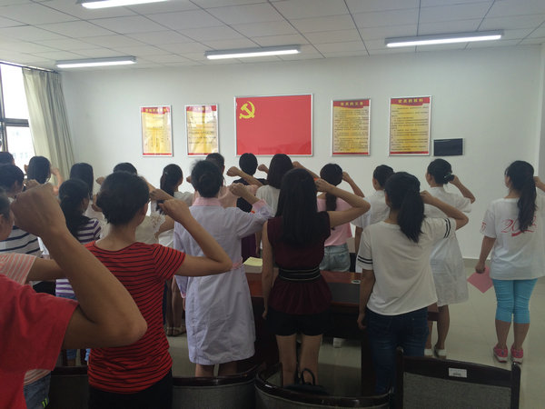 在激情嘹亮的《国际歌》过后,全体党员立正,面向党旗举起右手,握拳过肩,在杨英副书记的带领下,面向党旗庄严宣誓:“我志愿加入中国共产党……随时准备为党和人民牺牲一切,永不叛党。”每个新党员都激动而又坚定地立下了自己一生无悔的誓言。