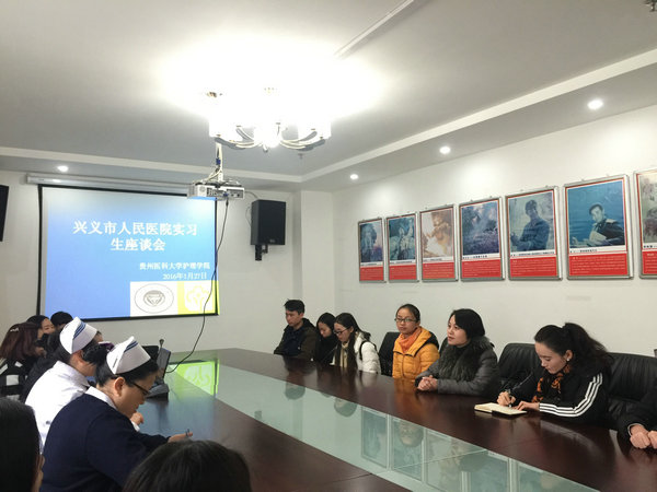 2016年1月26、27日,37000vip威尼斯党委副书记杨英、毕业班辅导员王晓玲赴兴义市人民医院看望实习同学,并会同医院分管领导和临床带教老师与实习生召开了座谈会。