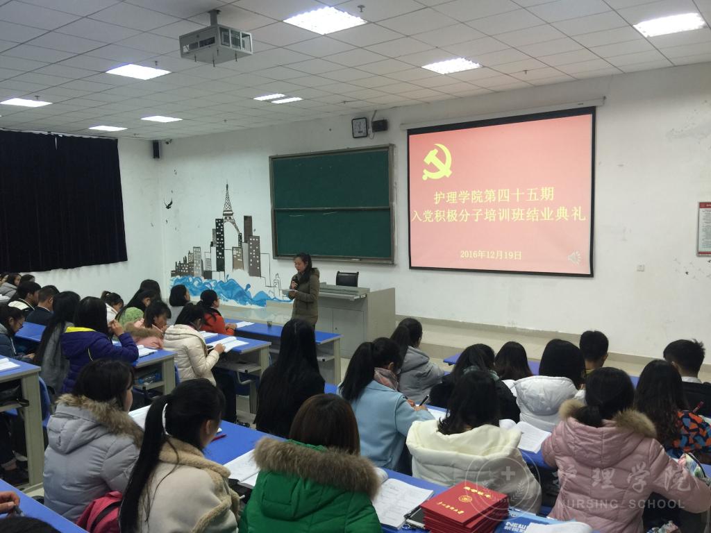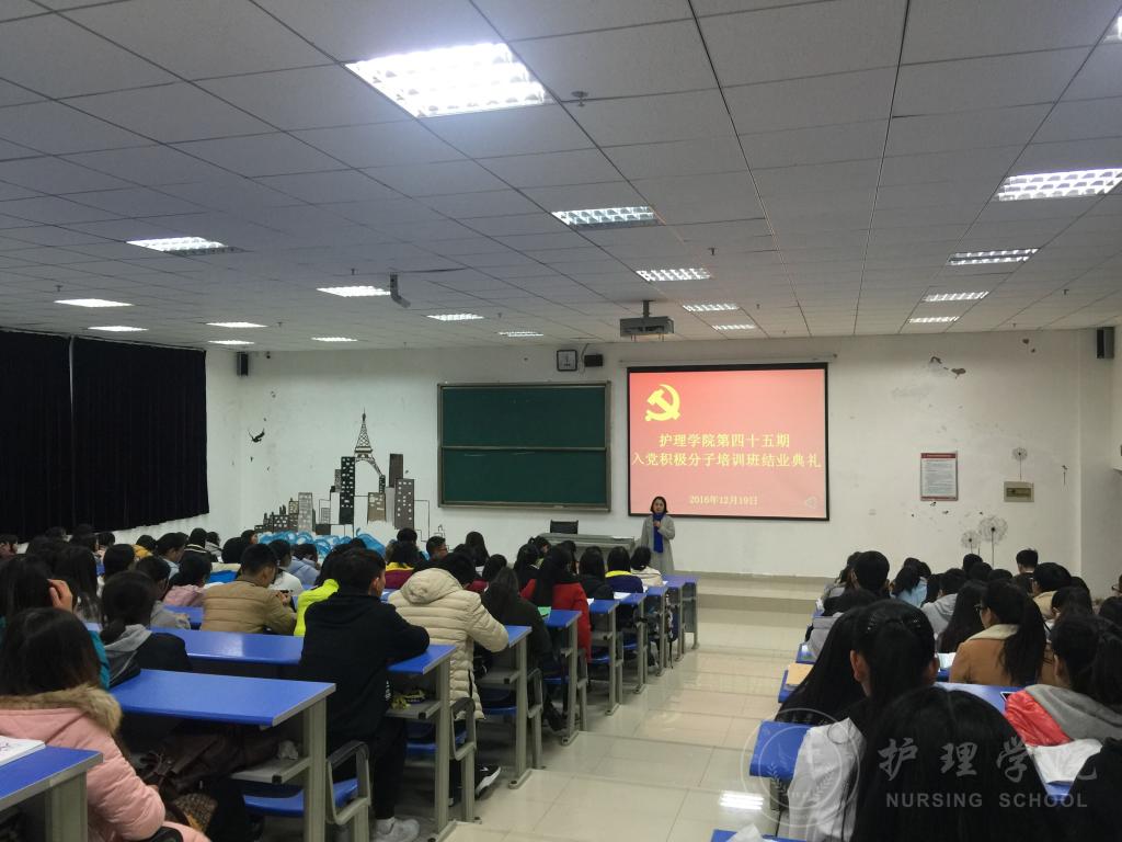 12月19日下午,37000vip威尼斯第四十五期入党积极分子培训班结业典礼在37000vip威尼斯南校区1404教室举行,37000vip威尼斯党委副书记杨英、37000vip威尼斯教工党支部支委毕丽、37000vip威尼斯学生第一党支部书记李颖和133名入党积极分子参与了结业典礼。