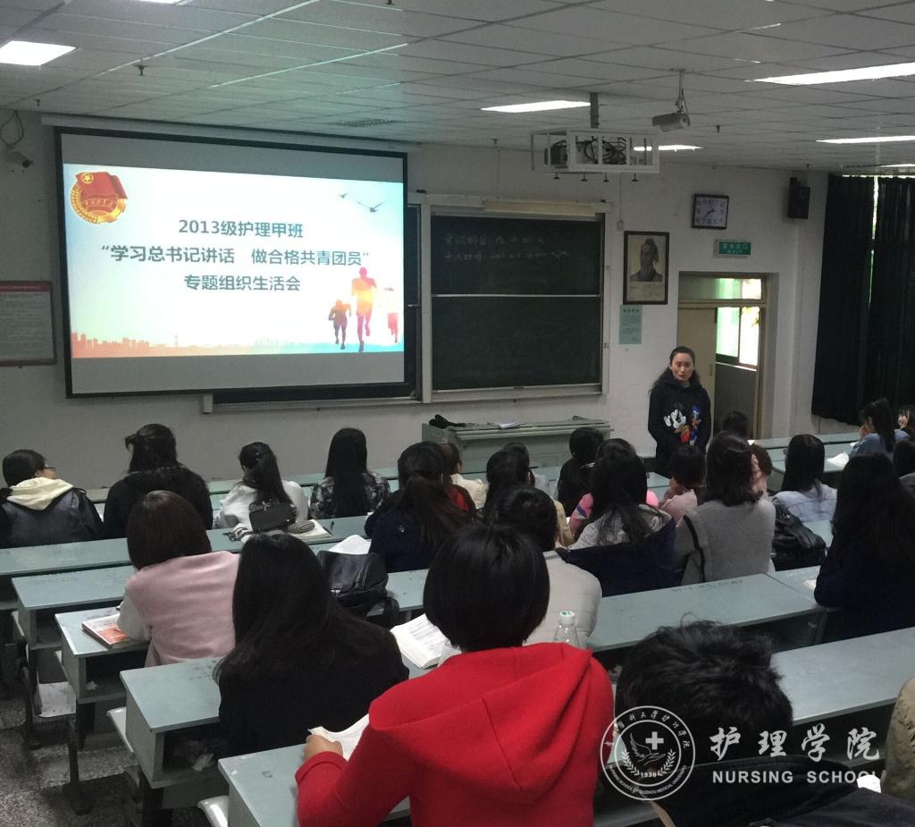 4月21日下午15时,37000vip威尼斯在北校区3301教室举行了“学习习近平总书记重要讲话,做合格共青团员”专题组织生活会,参会的有37000vip威尼斯分团委负责人王晓玲老师和2013级护理甲班全体同学。