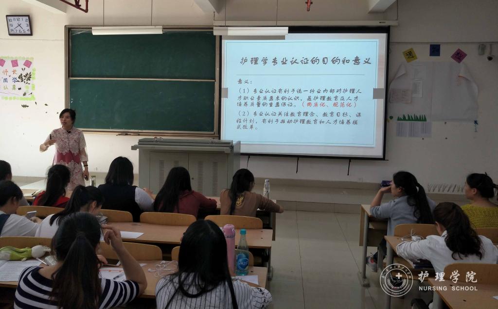 在2014级护理班、2016级护理甲班及护理乙班,卢海霞老师首先详细介绍了什么是“护理学专业认证”。其次,从“护理专业认证的目的和意义、认证的关键、认证考察与学生相关的重点”等方面做了介绍,强调护理学专业认证的重要性,并联系自己的经历与同学们分享学习《护理学专业认证》的大纲内容。最后,卢海霞老师向同学们提出几点要求:希望同学们充分认识认证工作对建设发展学校和学院的重要意义,在迎接护理学专业认证的同时,加强自身建设与发展,成为全方位的栋梁之才。