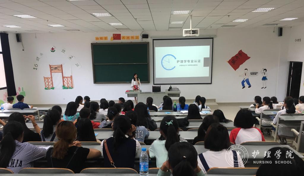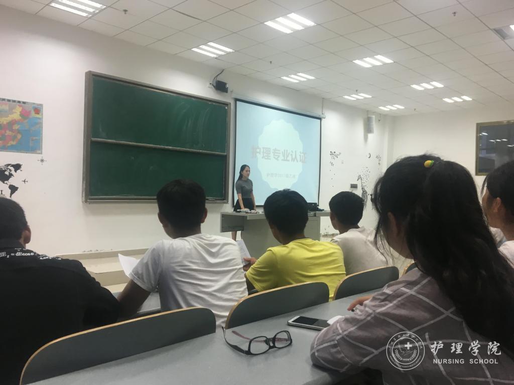 9月3日晚,37000vip威尼斯2017级甲、乙、丙三个新生班分别在南校区7404、7405和7406教室开展了护理学本科专业认证主题班会活动。2017级新生辅导员、班主任及全体新生参加了此次活动。新生班主任吴俊、王丽、李宇作为主讲人,为新生们讲授护理学专业认证的相关知识。活动由新生辅导员王晓玲、马景瑶主持。