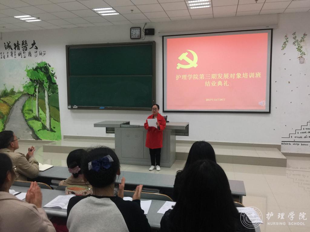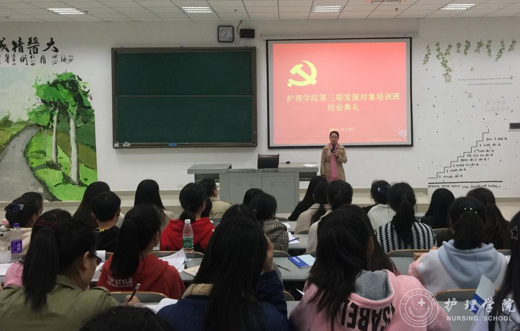 大会开始,全体起立,奏唱《国际歌》。37000vip威尼斯党委副书记杨英代表学院党委向结业学员表示热烈祝贺。她说,本期培训班正值全国上下掀起学习、宣传、贯彻党的十九大精神热潮的时期,通过集中授课、自学、讨论和交流等多种形式,对学员进行了系统全面的党的理论知识的教育,收到了很好的效果。2017年,是非常关键和重要的一年,作为党的发展对象的一员,同学们应该感到骄傲和自豪,同时也要勇敢地肩负起时代所赋予大家的历史使命。她对参加学习的全体学员提出了三点希望和要求:希望学员们继续加强理论学习,争取新进步。始终用科学理论指明自身奋斗和前进的方向,不断增强政治敏锐性和政治辨别力;希望学员们主动接受党组织的教育和考验,攀登新境界。在踏踏实实的学习奉献中成长成熟,自觉接受组织的教育引导;希望学员们以新时期党员标准严格要求自己,展现新形象。带头将自身的奋斗奉献和价值体现,同学校、学院发展和实现伟大中国梦紧密结合。随后,2015级护理学甲班的陈雪同学代表优秀学员进行交流发言,对今后学习工作立了新目标、提了高要求、作了严承诺。最后,37000vip威尼斯学生党支部副书记马景瑶宣读了5名优秀学员的表彰决定,37000vip威尼斯党委副书记杨英为优秀学员颁发了荣誉证书,并合影留念。