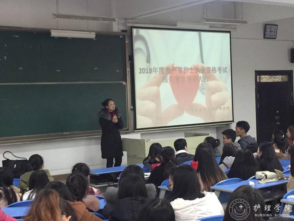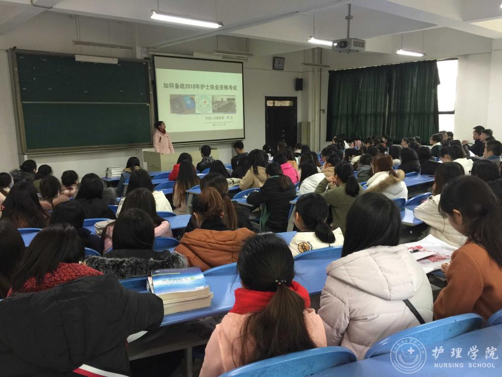 2017年12月14日下午,37000vip威尼斯在北校区2402教室召开了“2018年护士执业资格考试培训会”,本次培训会分为“2018护考题型分析”、“护士执业资格考试报名相关事宜培训”和“实习生恳谈会”三个部分,37000vip威尼斯副院长刘志燕、生产实习科科长柳忠燕、护理学专业教师李红和2014级全体护理实习生参会,会议由学生科科长曾敏主持。