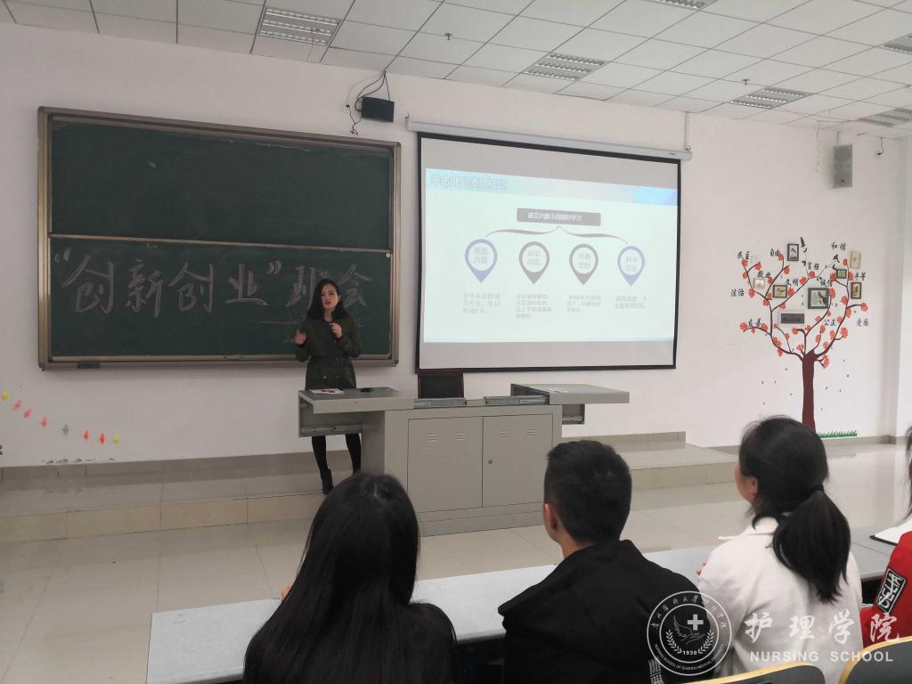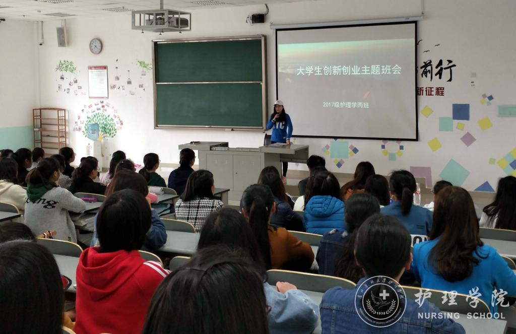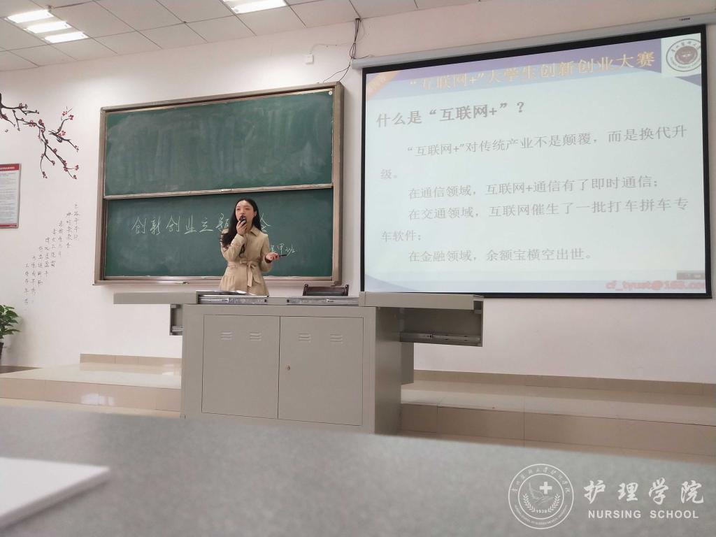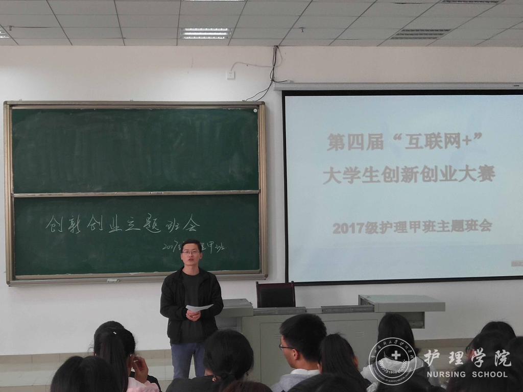 王晓玲、马景瑶分别解读了国家对大学生创新创业的支持政策、学校的大学生创新创业大赛通知、学校对大学生创新创业的激励政策、37000vip威尼斯学生在历年创新创业大赛活动中的获奖情况等,使广大新生对创新创业有了一个基本的了解。王晓玲、马景瑶鼓励同学们在认真完成专业学习的基础上积极参加创新创业活动,在创新创业中增长智慧才干,在艰苦奋斗中锤炼意志品质,在服务社会中成就人生价值。接着,由班主任吴俊、王丽、李宇分别在2017级护理学甲班、乙班、丙班以第四届“互联网+”大学生创新创业大赛为主题进行了专题讲授。班主任老师分别从大赛主题、参赛内容、准备方法等方面具体介绍了大学生创新创业大赛,激发同学们参与的意识。