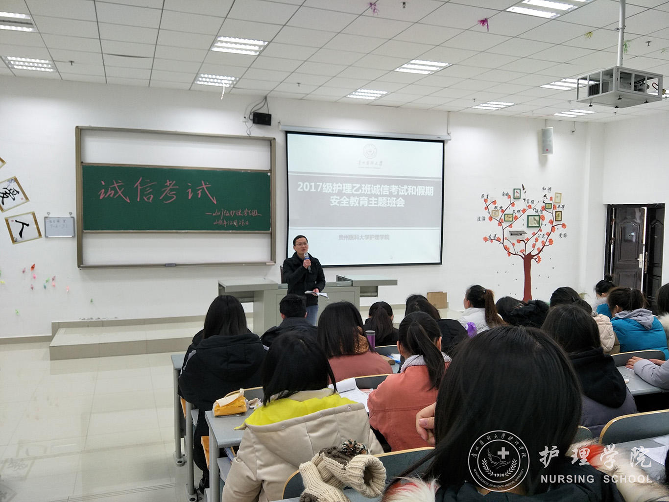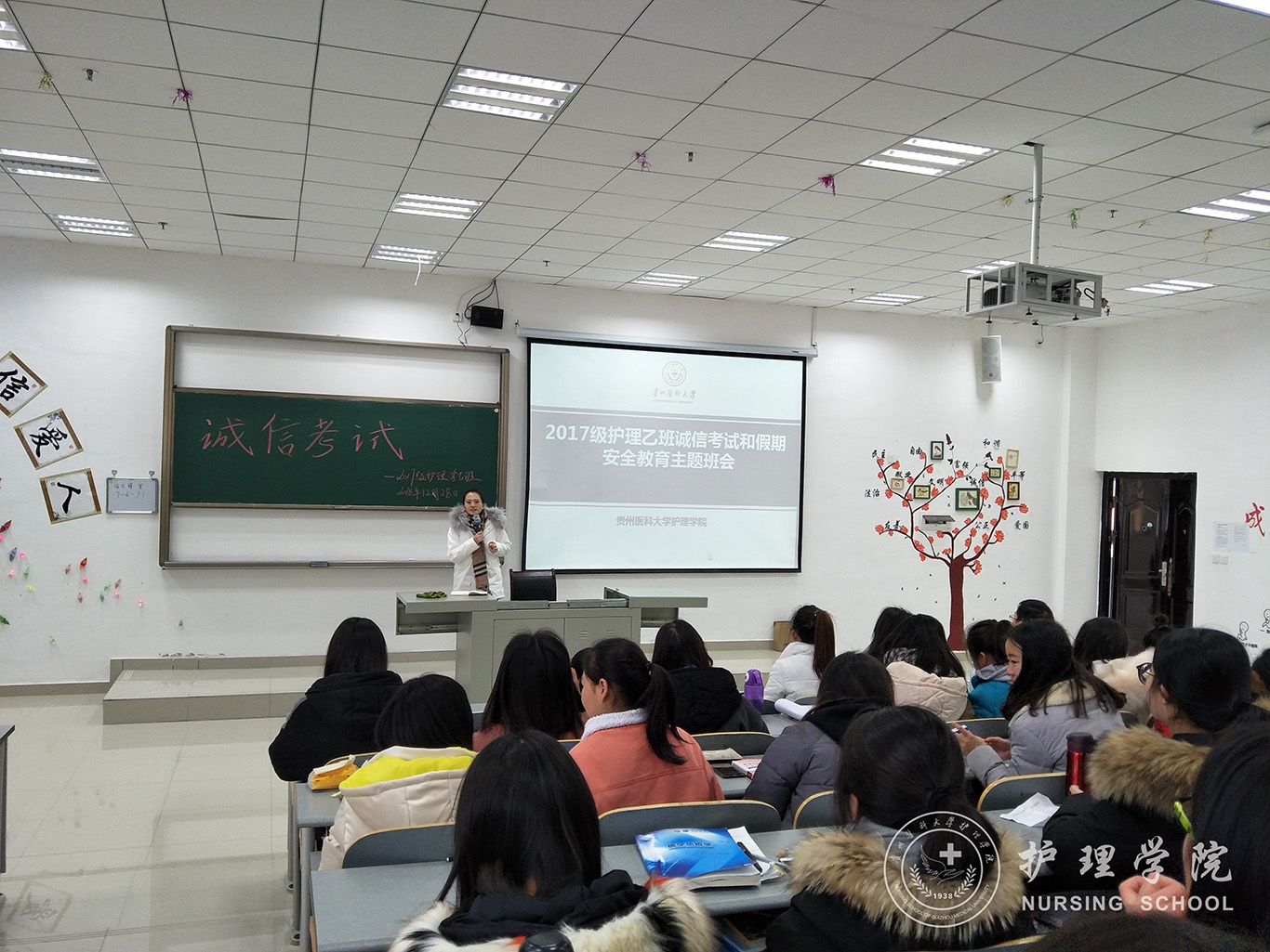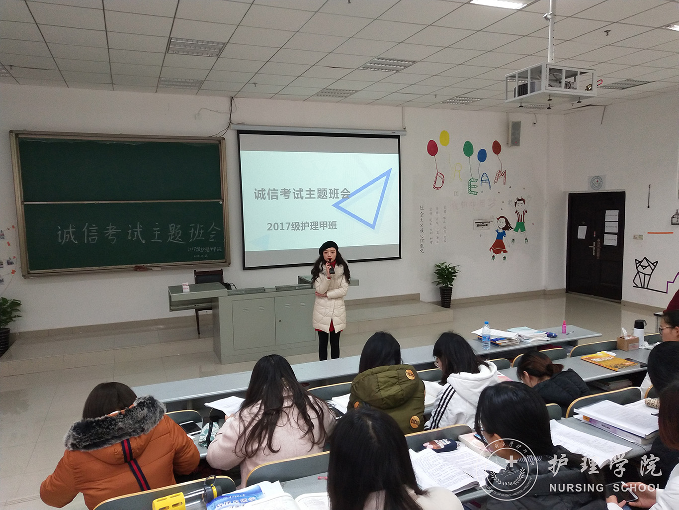 12月28日下午,37000vip威尼斯在南校区7404和7406教室开展诚信考试主题班会。班会由2017级护理甲班、乙班两班班长主持,班主任吴俊、王丽和辅导员马景瑶主讲,全体同学参加。