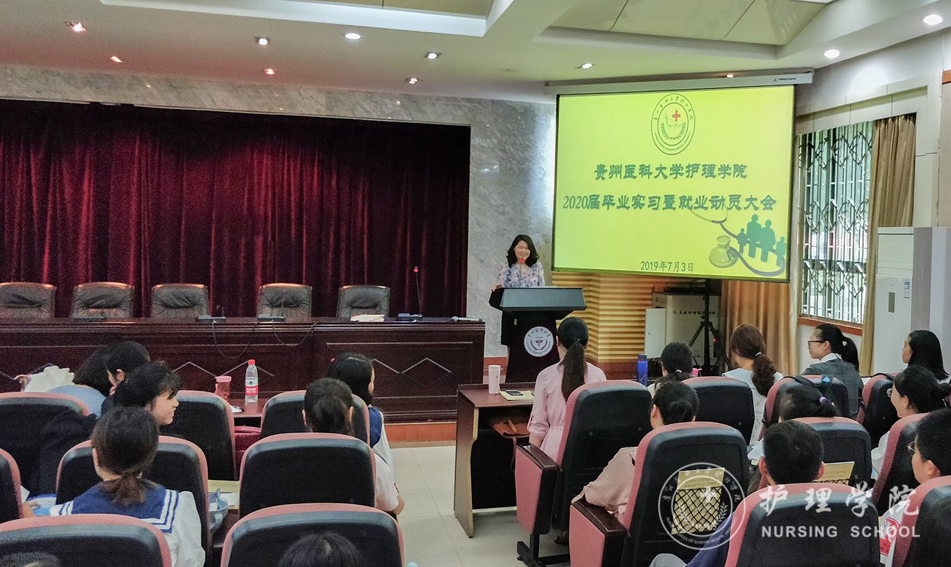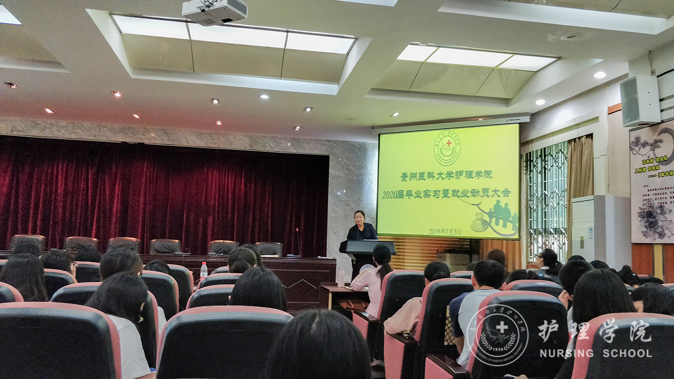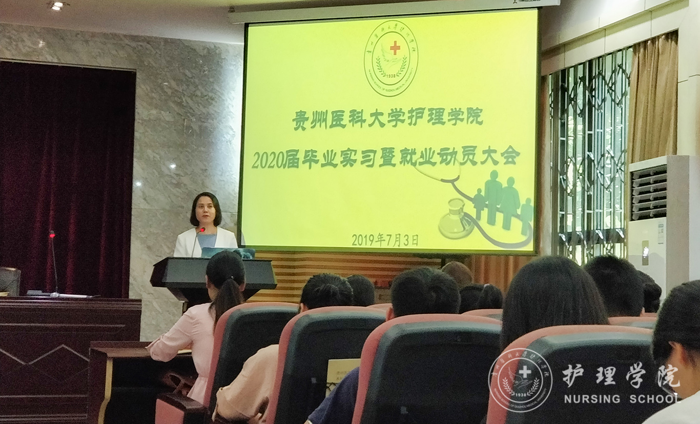 为帮助即将步入实习的同学们正确认识实习,做好实习准备,了解就业形势,明确就业方向,7月3日,37000vip威尼斯在北校区道德讲堂召开了“2020届毕业实习暨就业动员大会”。37000vip威尼斯党委书记杨英、副院长刘志燕、生产实习科科长柳忠燕、学生科科长曾敏以及2016级全体同学参加了本次大会。会议由曾敏主持。