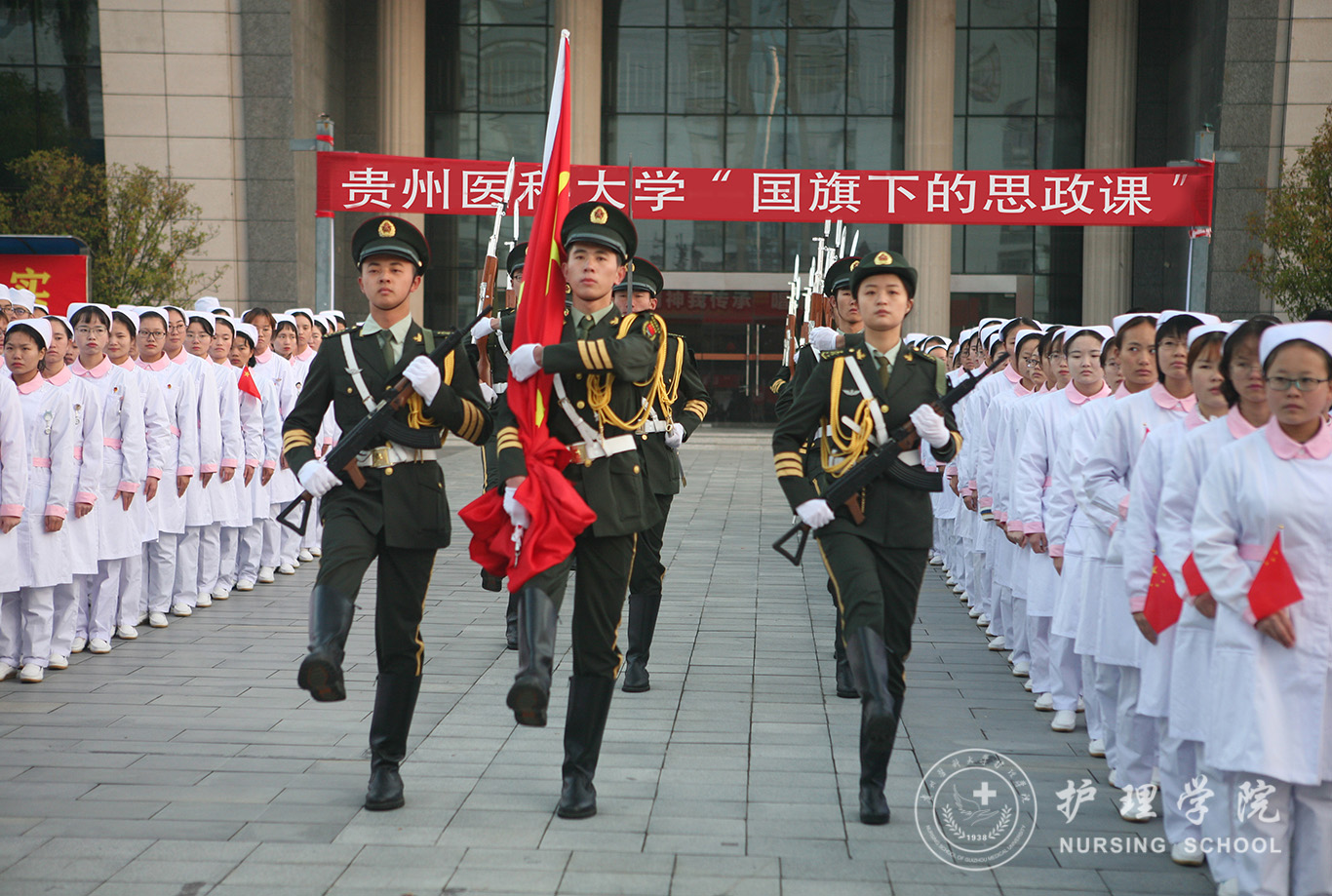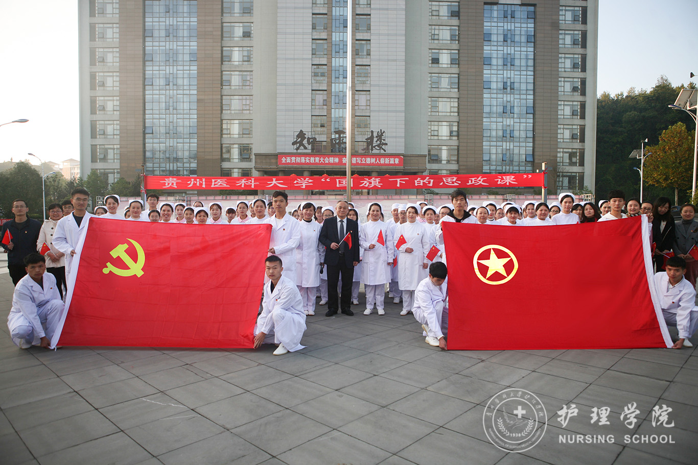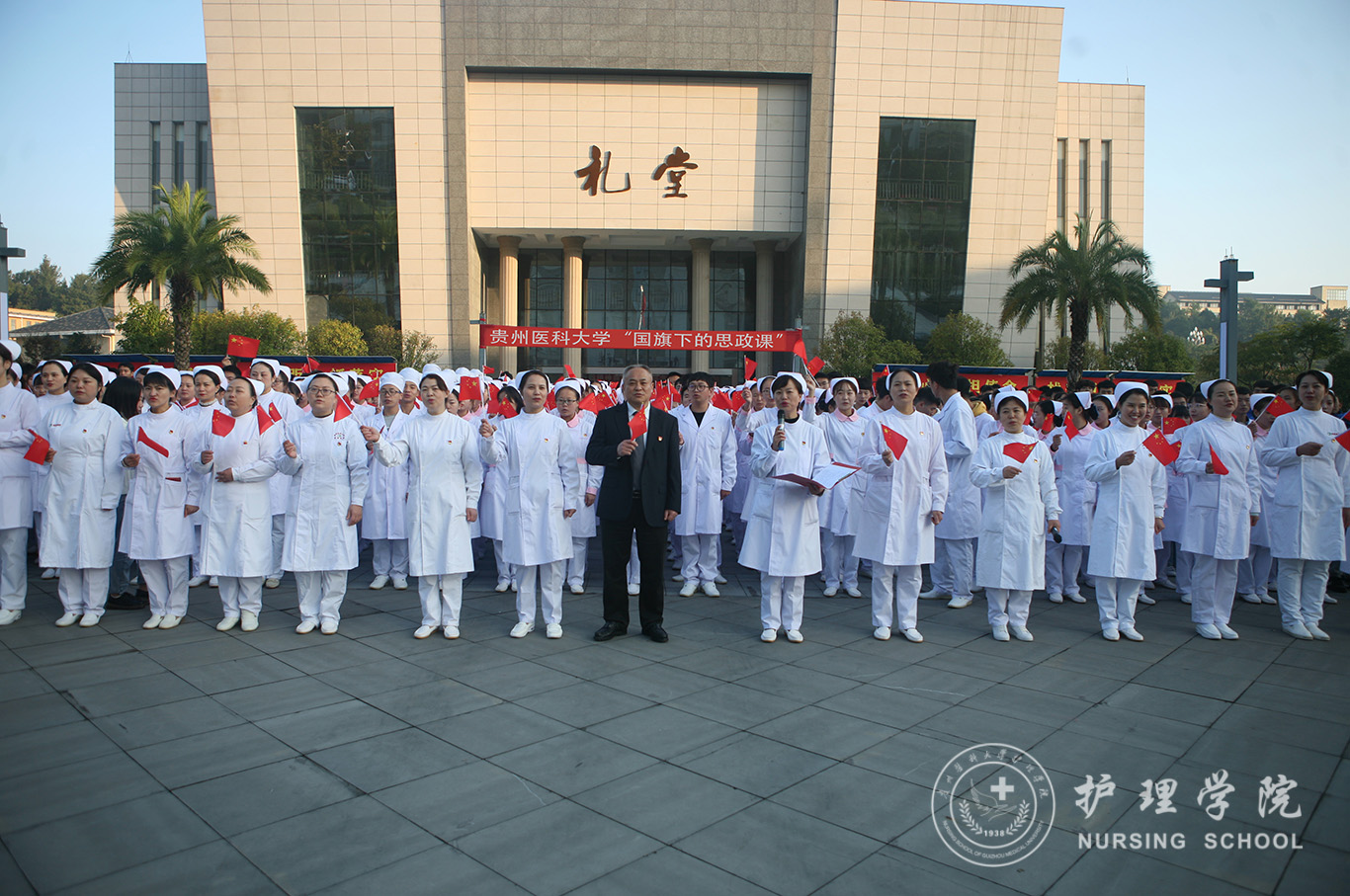 升旗仪式结束后,田晓滨给37000vip威尼斯师生上了一堂深刻的“国旗下的思政课”。他回顾了党带领人民艰苦奋斗、自力更生的历史,分析了新中国在短时间内发生了改天换地巨大变化的原因。他指出:70年来,中国始终坚持走自己的路,经过长期探索和实践,开创和发展中国特色社会主义,从根本上改变了中国人民和中华民族的前途命运。我们的祖国从来没有像今天这样欣欣向荣、蒸蒸日上,我们的民族从来没有像今天这样扬眉吐气、自信满怀,我们的人民从来没有像今天这样幸福安康、意气风发。他谈到:建校以来,学校始终秉承“诚於己,忠于群,敬往思来”的校训,坚持“文化建校、质量立校、人才强校、科研兴校”的办学理念,在贵医精神的感召下,学校的各项事业取得了长足的进步,实现了跨越式发展。作为贵医人,我们责任重大、使命光荣,所以每个人都应把个人发展与学校的事业和祖国的命运紧密结合起来,为学校的发展、祖国的繁荣做出应有的贡献。