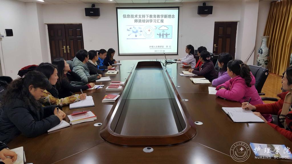田晶首先汇报了赴苏州参加2017中国生命关怀协会国际学术年会的见闻和体会,以及参观苏州大学医学部37000vip威尼斯技能实验室情况。田老师结合所学对比了威尼斯《护士人文修养》教学中的优势与不足,提出了今后应深入探讨适合威尼斯的教学方法。李红老师做了题为“信息技术支持下教育教学新理念师资培训”的汇报,为大家介绍了“医教协同”下医学教育六大变化、医学信息技术方面新课程的开展实施等内容,分享了自己的感悟。